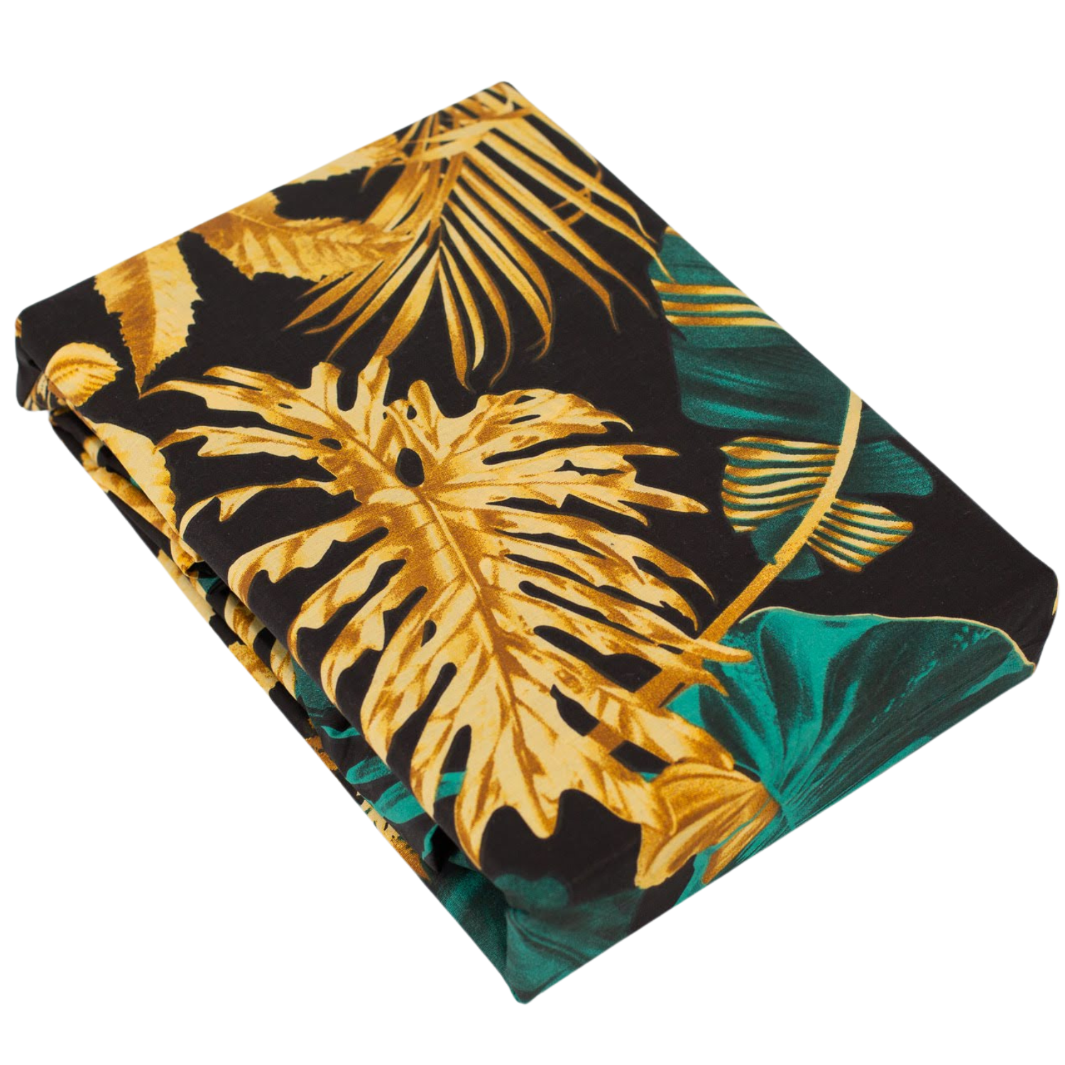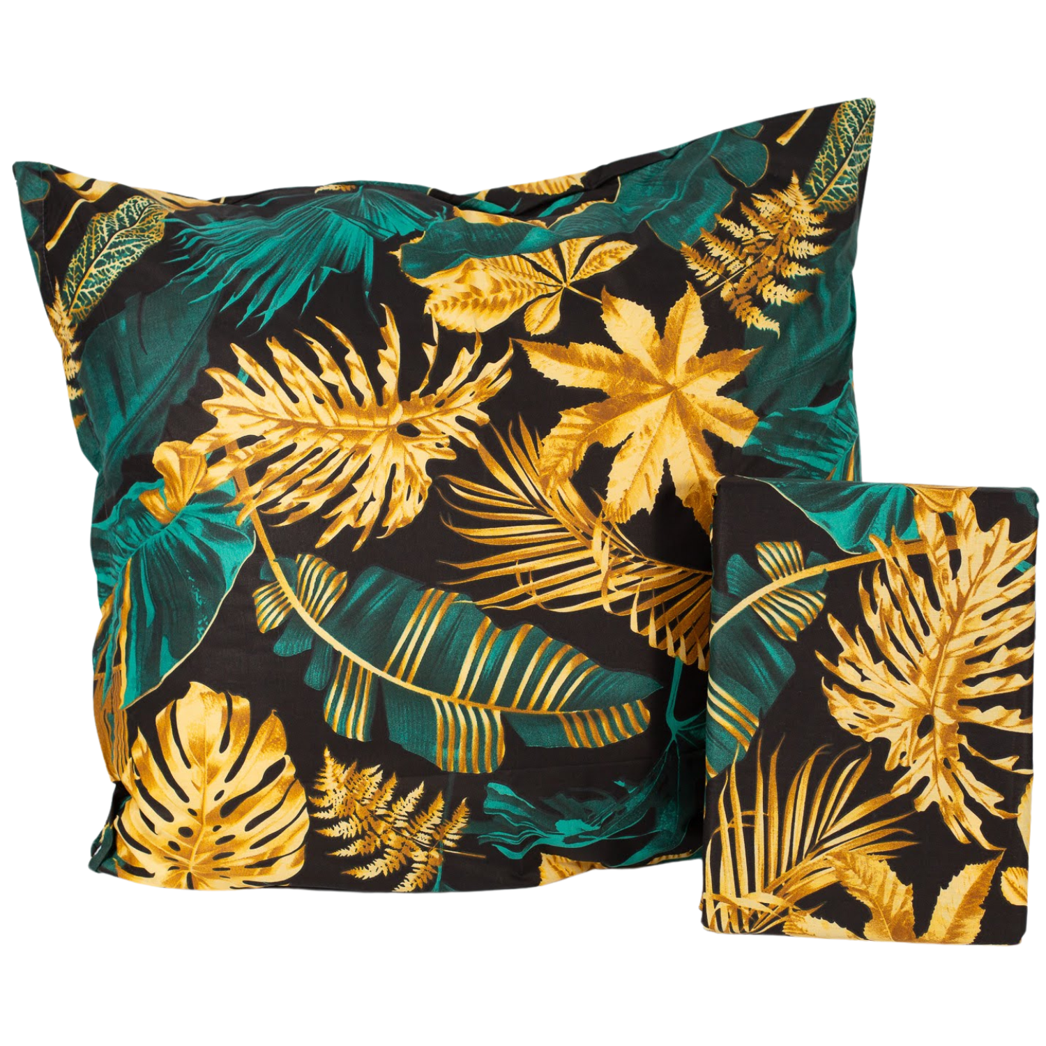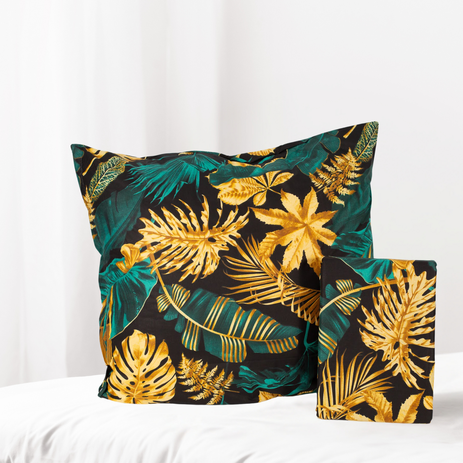 Zestaw zawiera poszwę na kołdrę 160x200 cm oraz dwie poszewki 70x80 cm. Wykonany z wysokogatunkowej bawełny o satynowym wykończeniu, gwarantuje miękkość, trwałość i luksusowy wygląd. Tropikalny wzór liści w żółto-zielonych odcieniach wnosi do wnętrza egzotyczny klimat i świeżość. Praktyczne zamki błyskawiczne ułatwiają codzienne użytkowanie, a oddychająca tkanina zapewnia komfort snu przez cały rok.