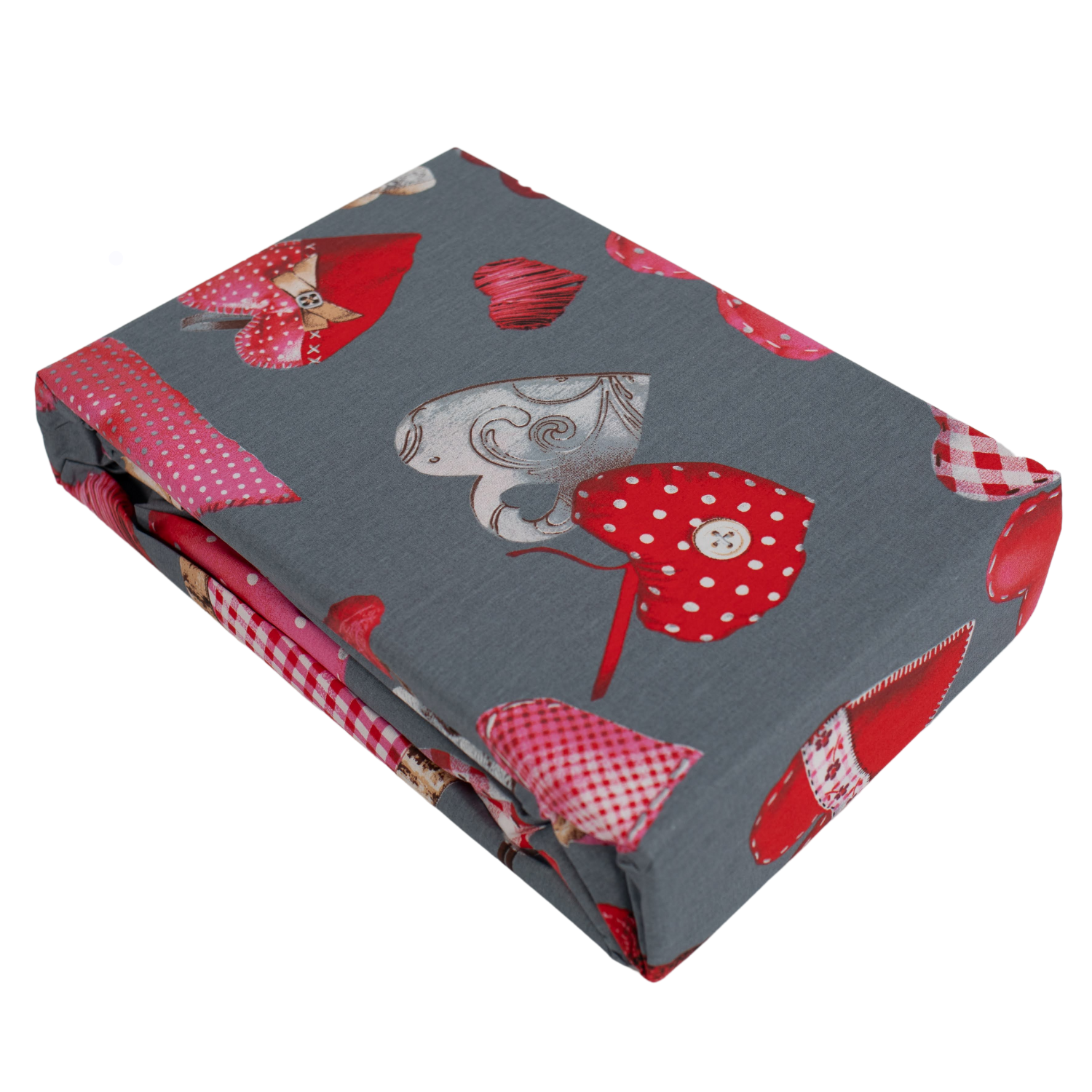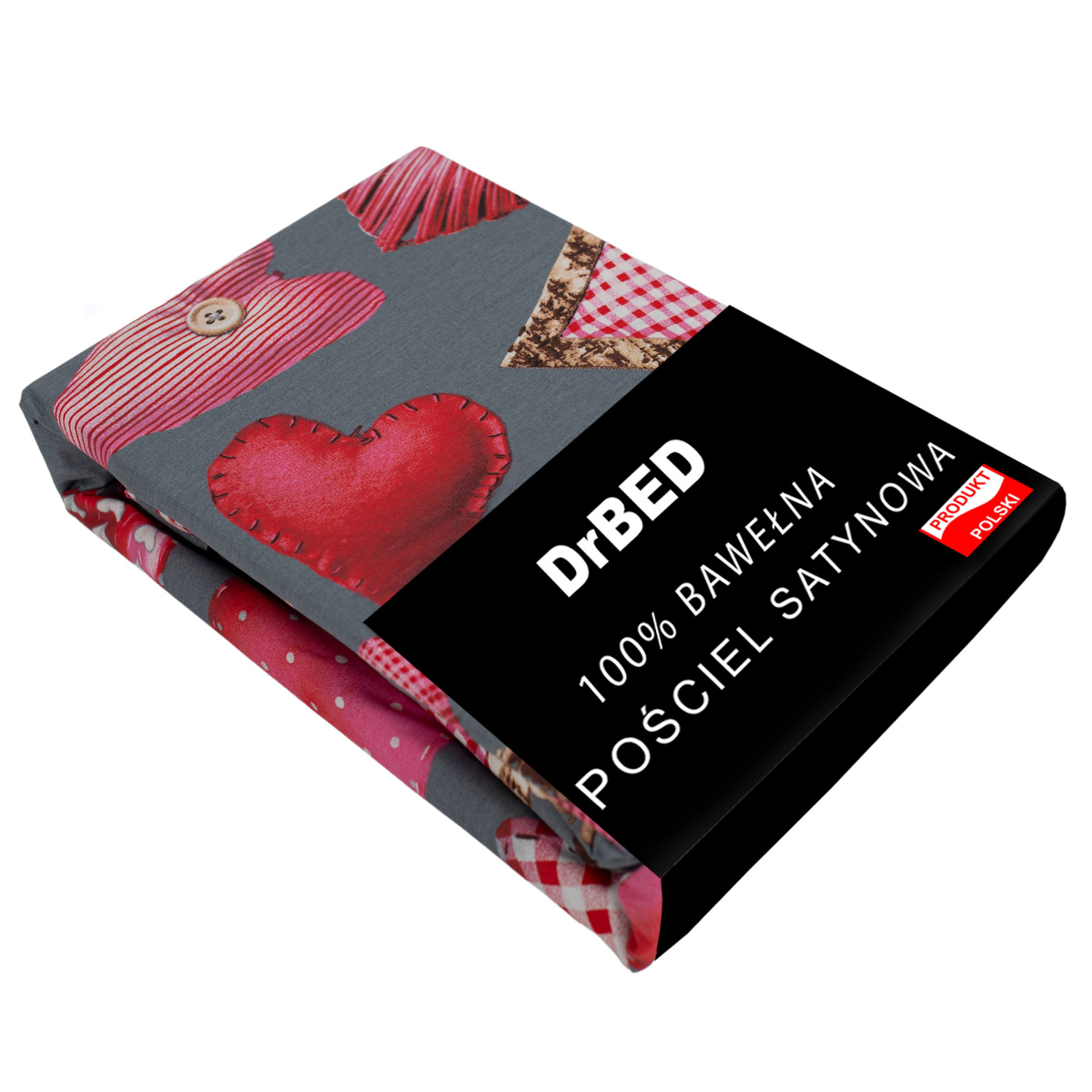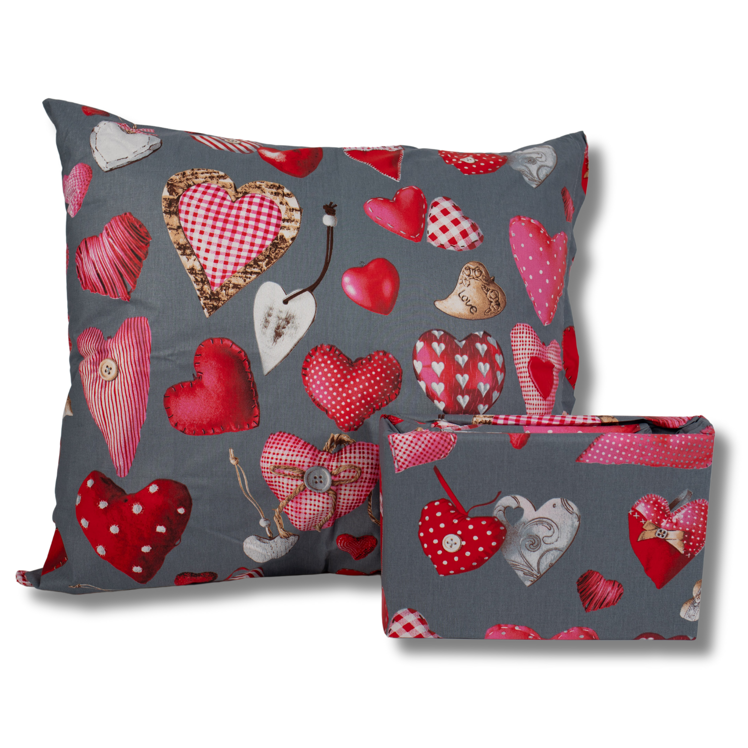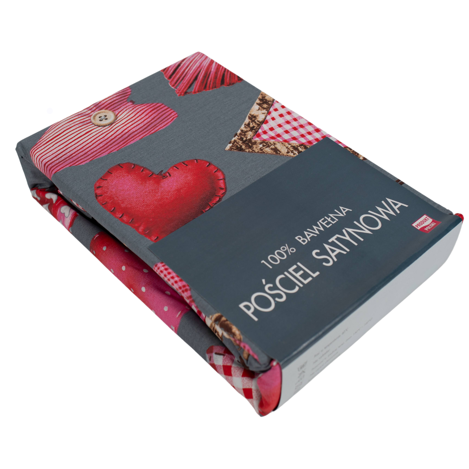 Grafitowe tło z różnorodnymi wzorami serc w odcieniach czerwieni i różu nadaje pościeli wyjątkowego charakteru. Subtelne detale, takie jak kratka czy guziki, sprawiają, że pościel doskonale komponuje się z wnętrzami w stylu rustykalnym i vintage.